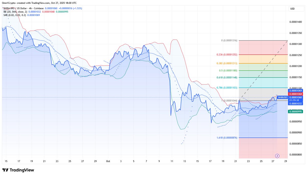 At the current moment, Shiba Inu coin’s (SHIB) technical price structure nears a break point at $0.00001068, which stands for the red-label Bollinger Band (BOLL). If sustained above, a close above could as well pave the way to $0.00001200, a mid-point Fibonacci level that would restore Shiba Inu’s price levels lost during the drastic October 11, 2025 market dip.