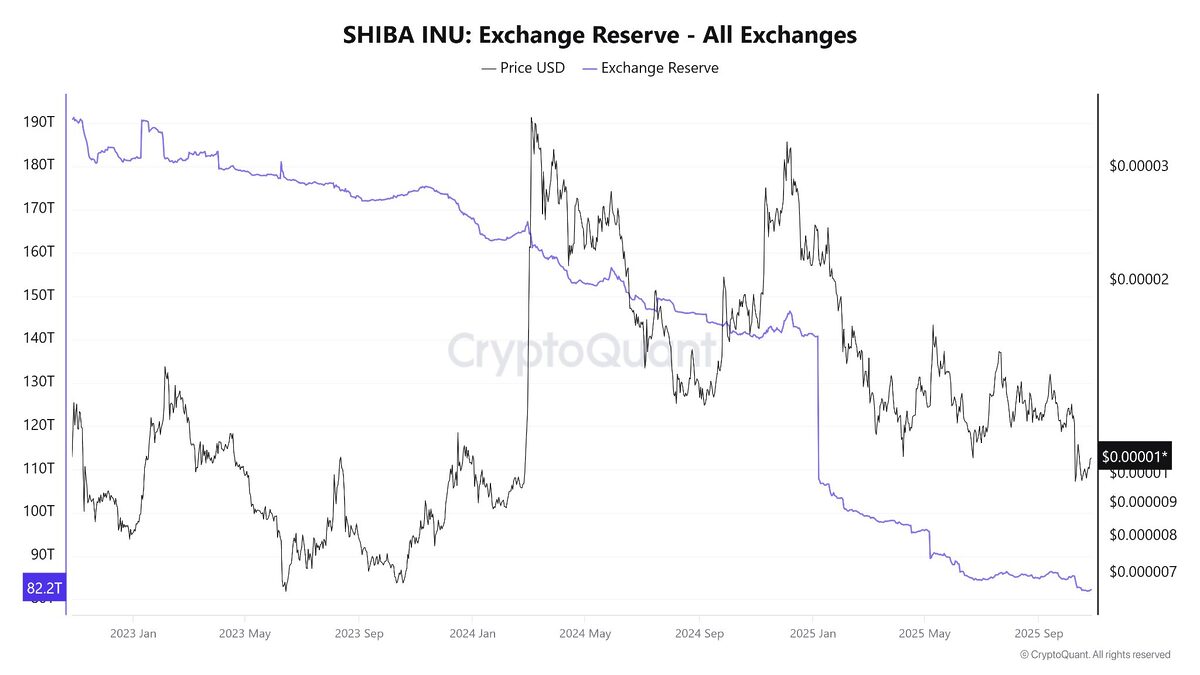However, the dwindling trading volumes don’t necessarily scream bearish – in Shiba Inu’s case, this has to do with the meme coin’s scarcity on major exchanges (CEXs). Since early 2025, the liquidity crunch has been noticeable. Beginning the year at 140.7 trillion SHIB tokens, now the centralized exchanges (CEXs) had pushed this figure to a four-year low, currently at 82.27T.